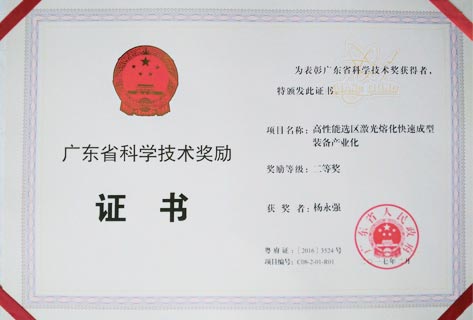 In 2016, the project of "Industrialization of High Performance Selective Laser Melting Rapid Prototyping Equipment" won the Second prize of Science and Technology Progress of Guangdong Province.